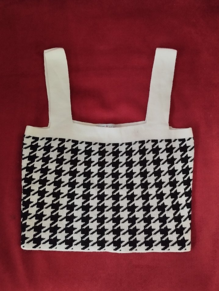Triko dokulu ve baskılı siyah beyaz desenli kadın günllük krop Sokak modasına uygun ve rahat kullanıma uygun.