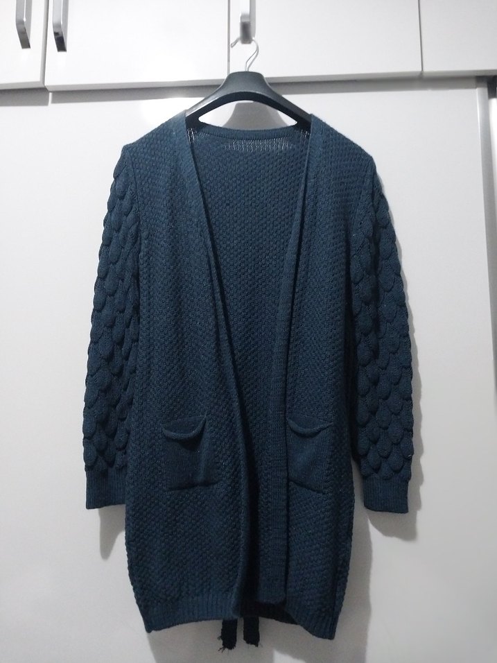 Lacivert renkli, örgü dokulu, uzun kollu ve bol kesim kadın hırka. Midi boyda, cep detaylı, rahat ve günlük kullanıma uygun. Oversize bir üründür bedeninize rahatlıkla olur.