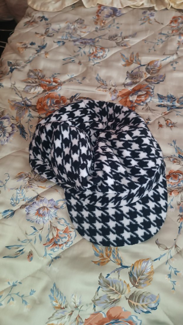 Sentetik kumaştan yapılmış, siyah beyaz örgü desene sahip, Paris sokak modasına uygun kadın şapkası.
