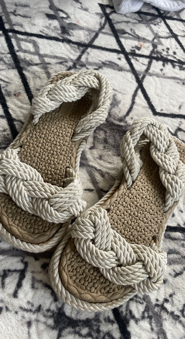 Örgü detaylı beyaz bantlara ve dokulu tabana sahip dolgu topuklu kadın sandalet, günlük kullanım için rahat ve bohem tarzda.