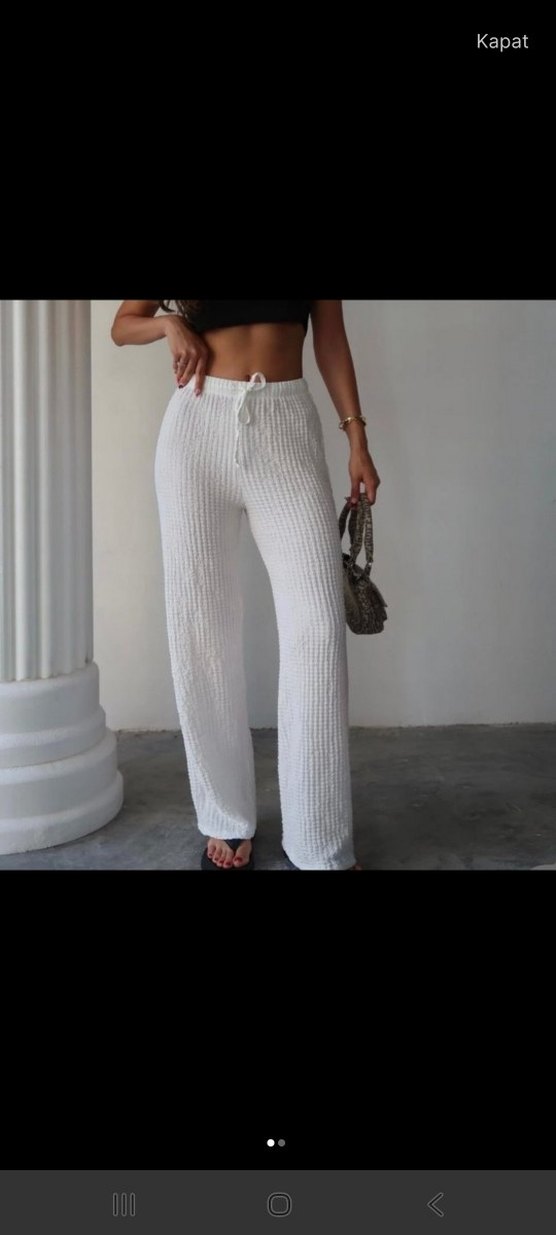 Örgü detaylı, keten kumaştan yapılmış beyaz, bol kesim midi uzunlukta kadın pantolonu. Rahat ve hafif kumaş, günlük sokak stili için uygun.