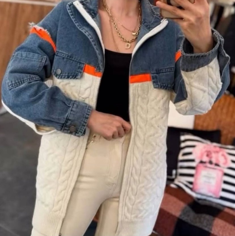 Kadınlar için kot ve örgü dokusunu birleştiren, bol kesim ve basen hizası uzunlukta ceket. Uzun kollu ve boğazlı, beyaz-mavi tonlarında turuncu şerit detaylı, günlük rahat stil için uygun. butik ürünü