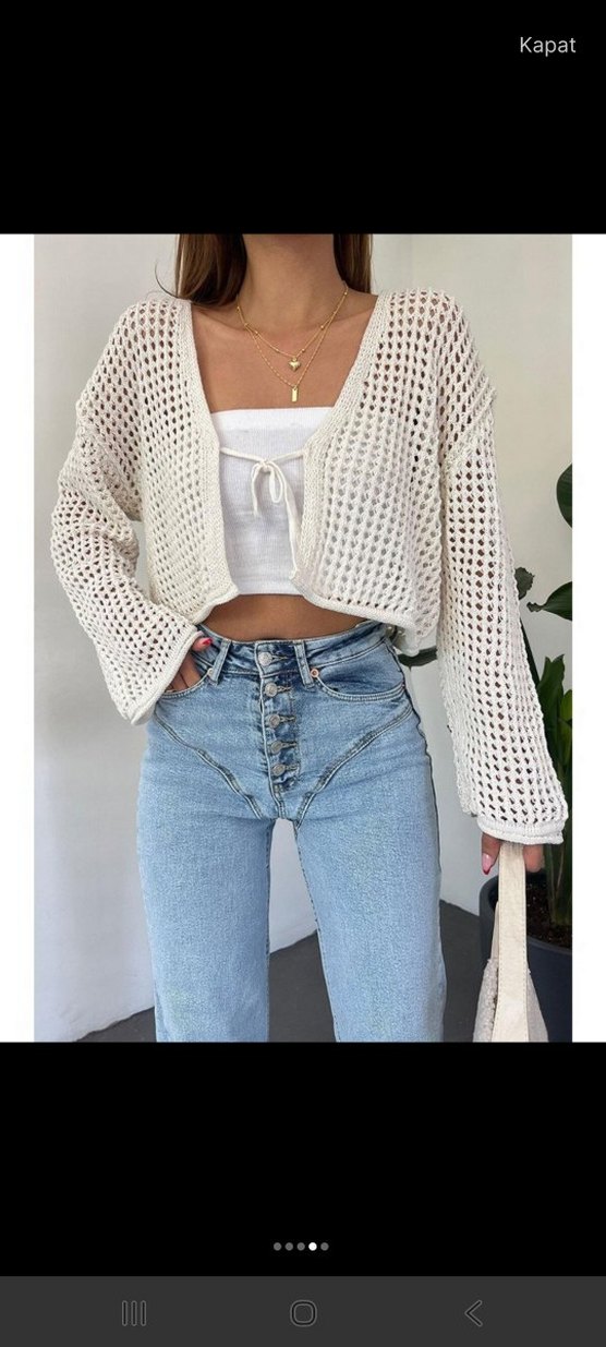 Beyaz renkli, örgü detaylı, V yaka, uzun kollu ve bol kesim kısa uzunlukta kadın kazak. Günlük kullanıma uygun rahat bir model.