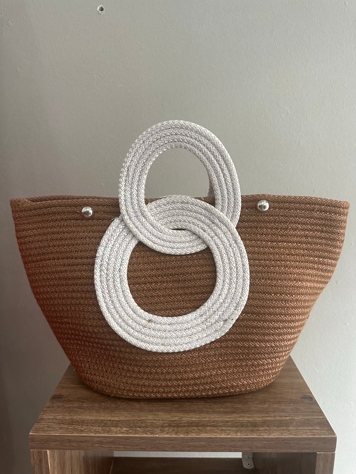 Açık kahverengi örgü dokusu ve beyaz örgülü dairesel kulplarıyla bohem tarzda kadın plaj çantası.