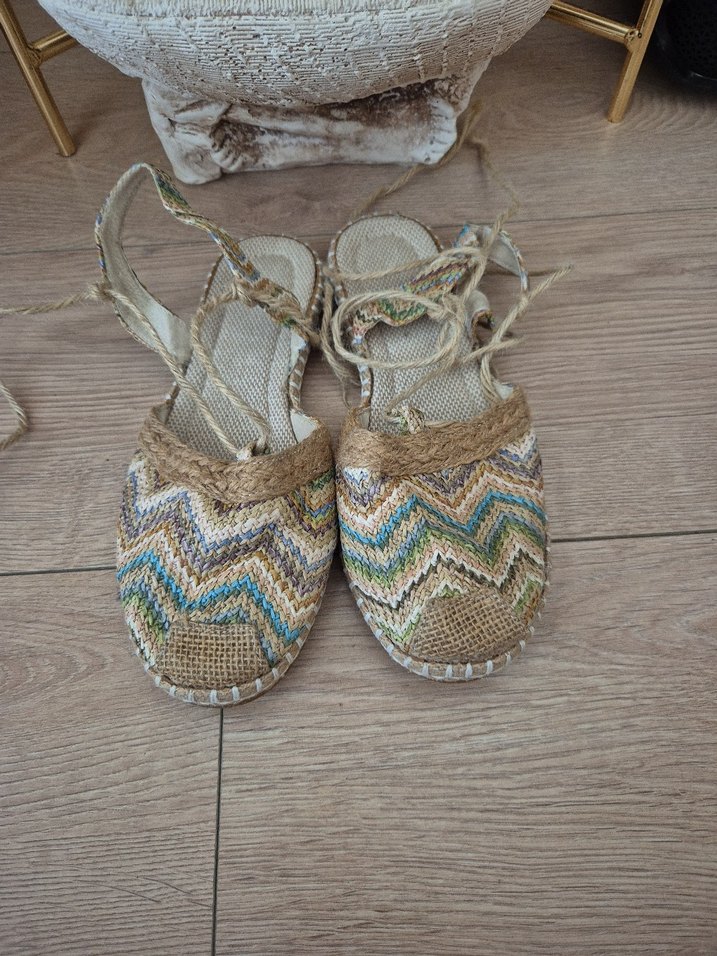 Kadınlar için çok renkli, hafif batik desenli örgü detaylı dolgu topuklu sandalet, günlük kullanım için uygundur.
