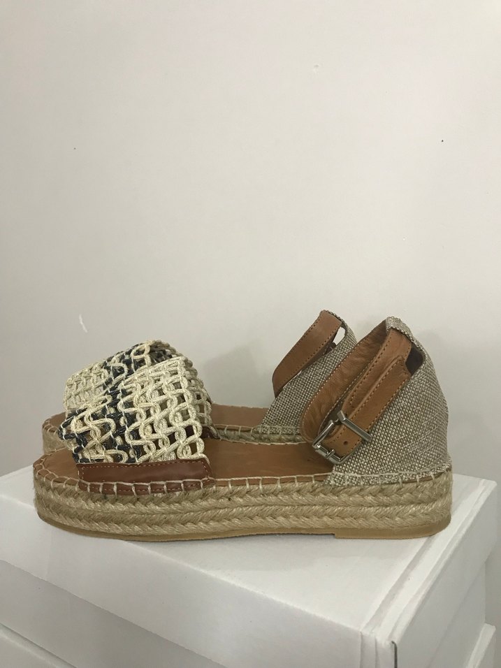 Dolgu topuklu, örgü detaylı ve kahverengi kemerli kadın sandalet. doğal dokuma tabanlı, günlük kullanıma uygun. 36-37-38-39 numaraları mevcut