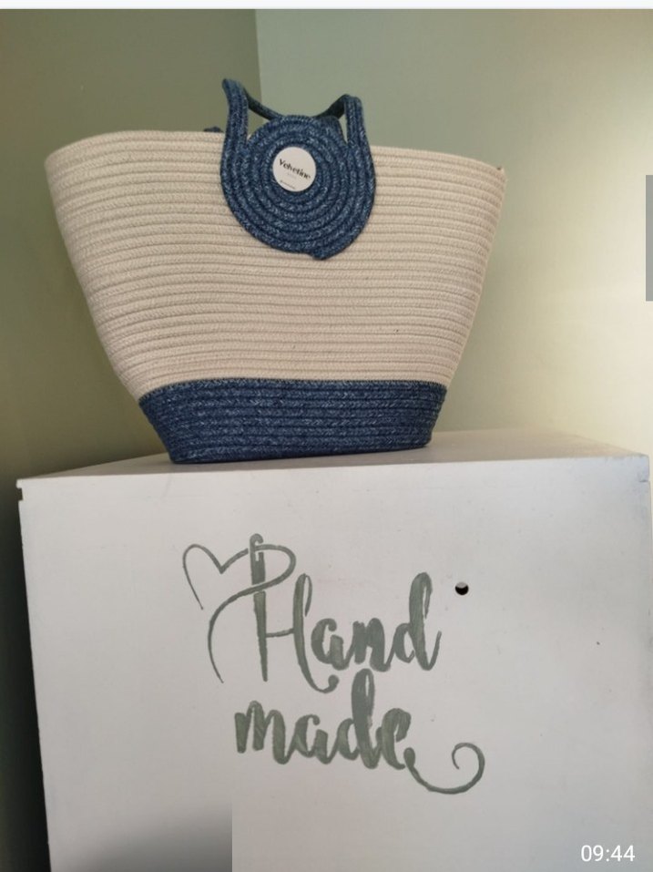 Sentetik kumaştan yapılmış, mavi ve gri tonlarda örgü detaylı kadın plaj çantası. Minimalist ve bohem tarzıyla trend günlük kullanıma uygun.