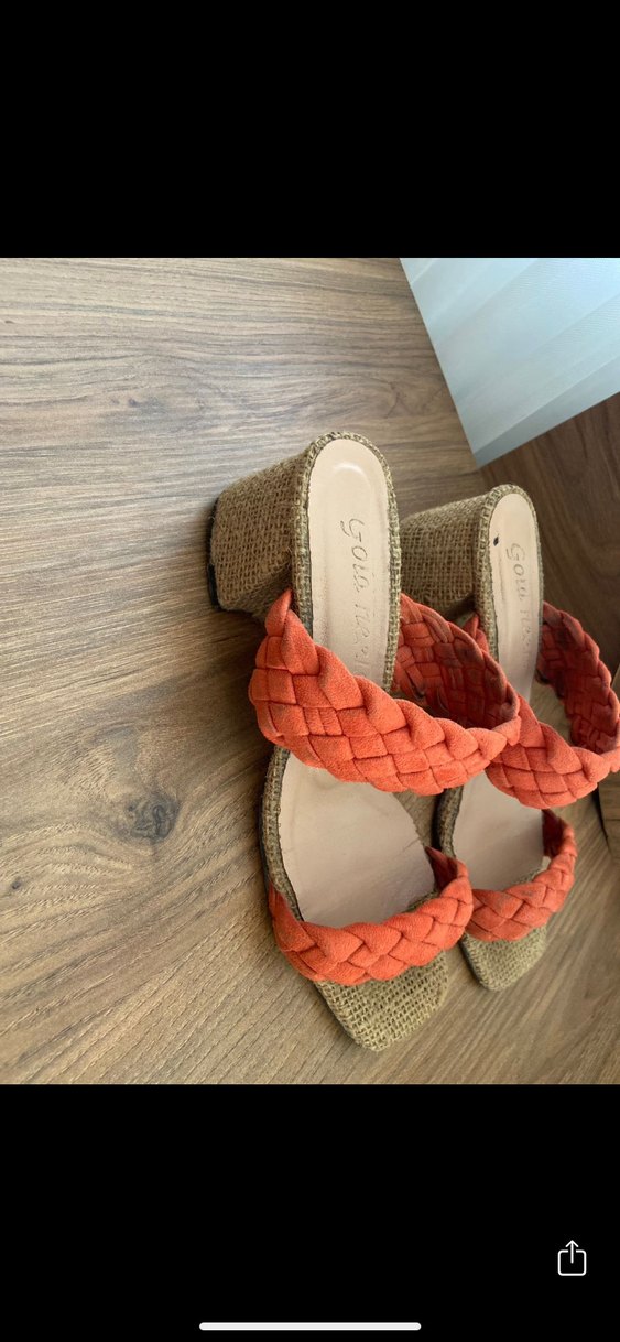 Kadınlar için örgü detaylı dolgu topuk terlikler, kahverengi taban ve turuncu örme bantlarla bohem tarzını yansıtıyor.