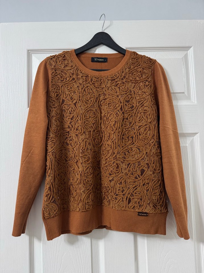 Bu kahverengi kadın kazağı, yuvarlak yaka ve uzun kolludur. Örgü ve nakış detaylarıyla bohem bir tarz sunar, rahat kesimlidir.