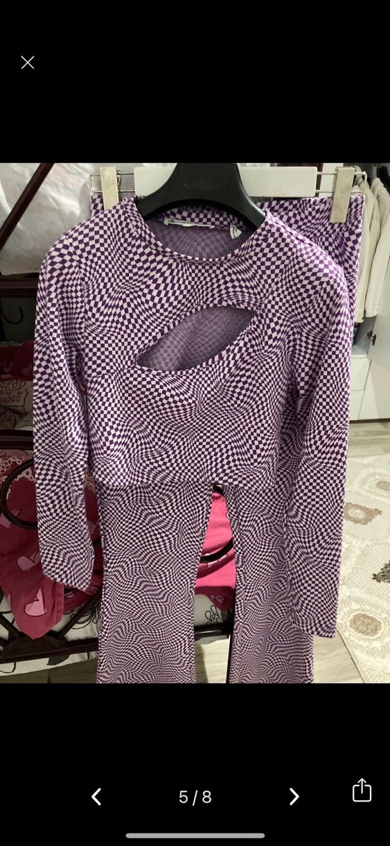 Uzun kollu, yuvarlak yakalı, mor kareli örgü detaylı sentetik kumaş bluz, ön kısmında kesik detayı ile sokak modasına uygun.