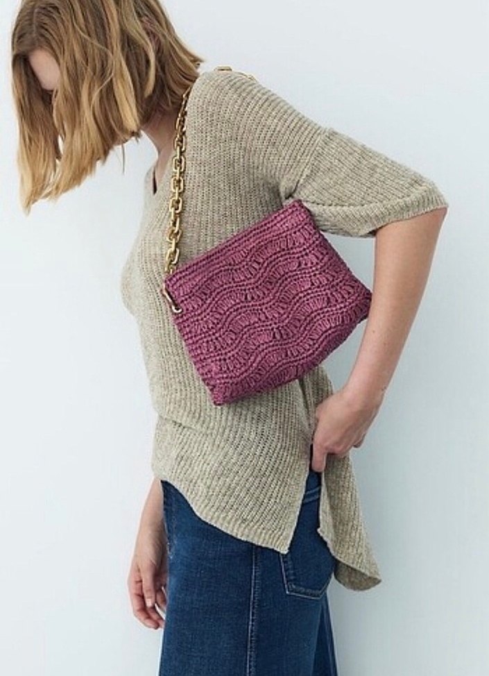 Pembe renkli, zincir askılı, örgü detaylı kadın çantasıdır. Günlük kullanıma uygun, bohem tarzda bir tasarımdır.