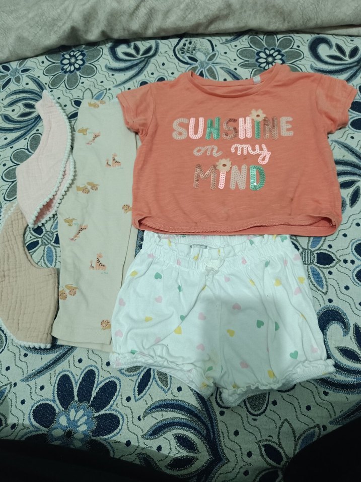 Pembe kısa kollu üstü 'SUNSHINE on my MIND' baskılı ve örgü detaylıdır. Pastel renkli desenli şort ve uyumlu şapka ile tamamlanmıştır.