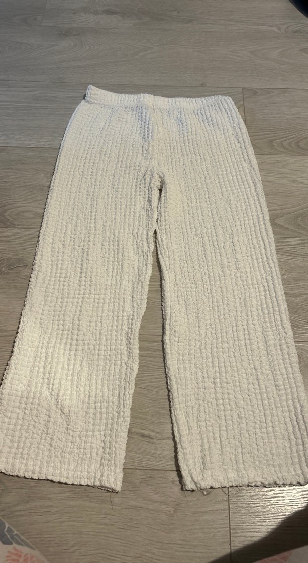 Örgü dokulu, rahat kesim ve midi boy beyaz keten çocuk pantolon, günlük kullanıma uygun sade ve konforlu bir modeldir.