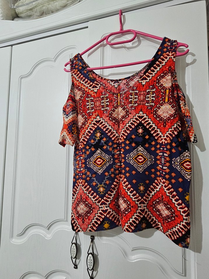 Renkli, örgü detaylı, V yakalı ve askılı kısa bohem bluz, rahat kesimi ve canlı desenleriyle günlük kullanıma uygundur. Ürün temiz ve çok az giyildi.