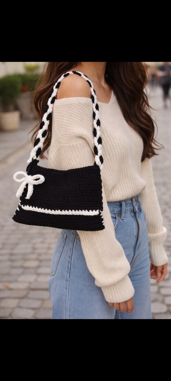 Kadın çanta, örgü siyah beyaz detaylar, örgülü askı ve dekoratif fiyonk ile günlük sokak stiline uygun.