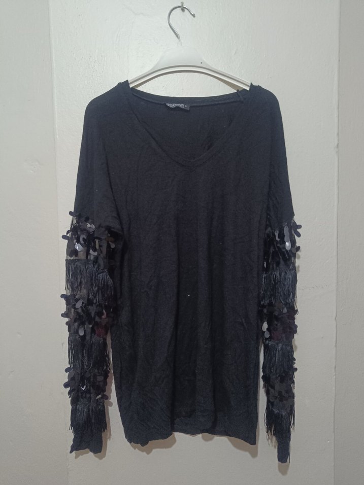 Bu siyah kadın bluz, örgü püskül detaylı uzun kollara ve yuvarlak yakaya sahiptir. Salaş kesim ve normal midi uzunluktadır, günlük kullanıma uygundur.