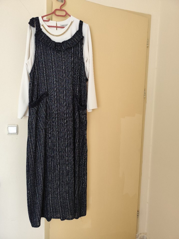 lacivert renkte, straplez yakalı ve örgü dokulu uzun, bol kesim elbise, gündelik kullanıma uygun.yeni dikilmiştir ürün hiç kullanılmamıştır alıcısına hayırlı olsun