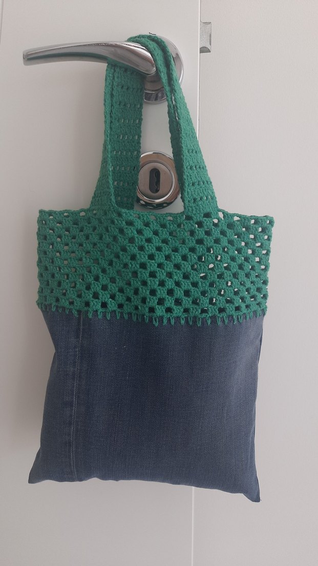 Yeşil renkte, örgü detaylı denim kadın çantasıdır. Üst kısmı dokulu ve yumuşak, sade tasarımı bohem tarzıyla tamamlar. Günlük kullanıma uygundur. 25×30 ölculerinde astarsiz. örgu kismi pamuk iptir.