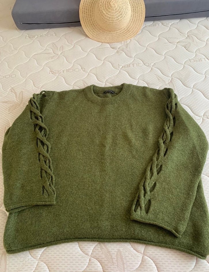 Örgü detaylı uzun kollu, yuvarlak yaka, bol kesim yeşil kadın kazak, günlük kullanıma uygundur.