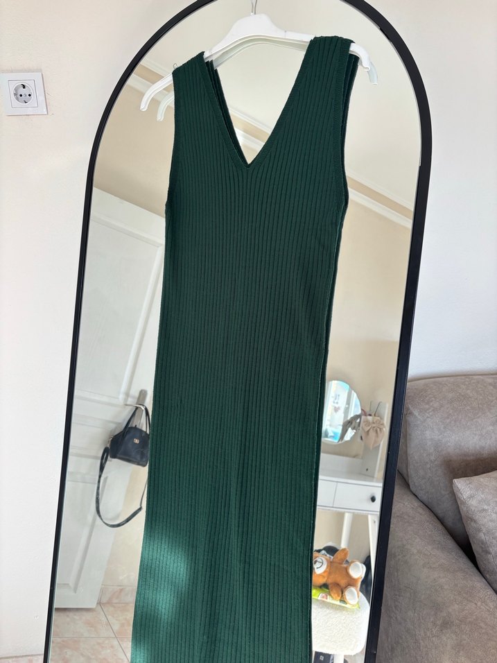 Koyu yeşil renk, örgü dokulu sentetik kumaştan, V yakalı ve kolsuz uzun elbise, sıkı kesimiyle sokak modasına uygun.