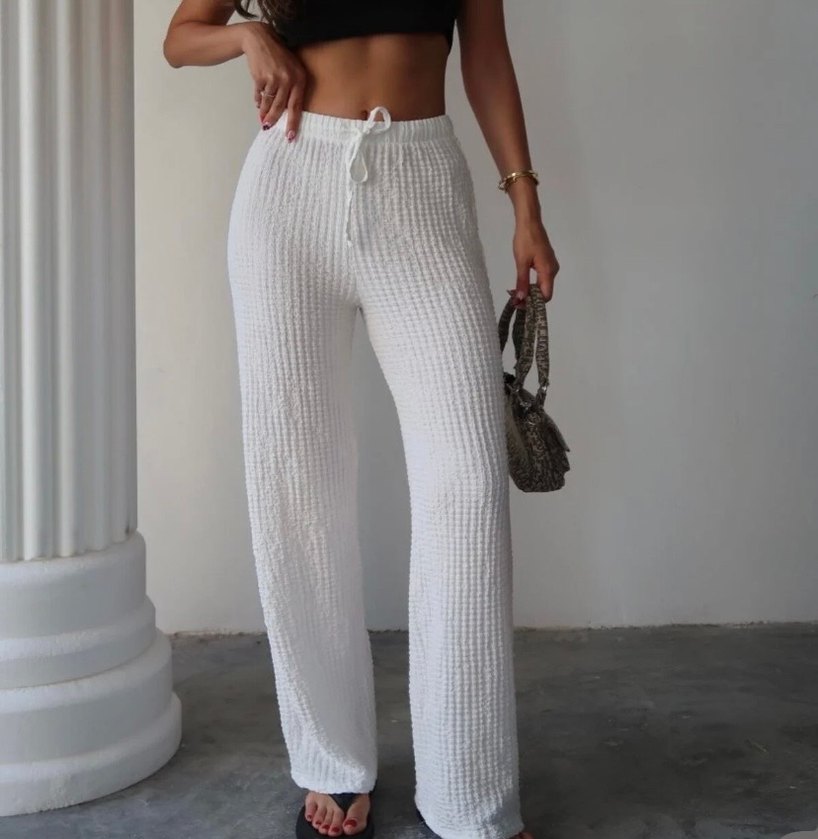 Örgü dokulu, keten kumaştan yapılmış beyaz pantolonlar, bol kesim ve midi boydadır. Rahatlık sağlayan bağcıklı bel detayına sahiptir.