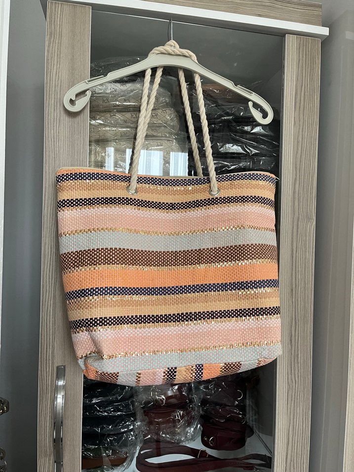 Örgü dokulu, pastel renkli çizgilerle bohem tarzda kadın çanta. Dayanıklı ip sapları bulunur, günlük kullanıma uygundur.