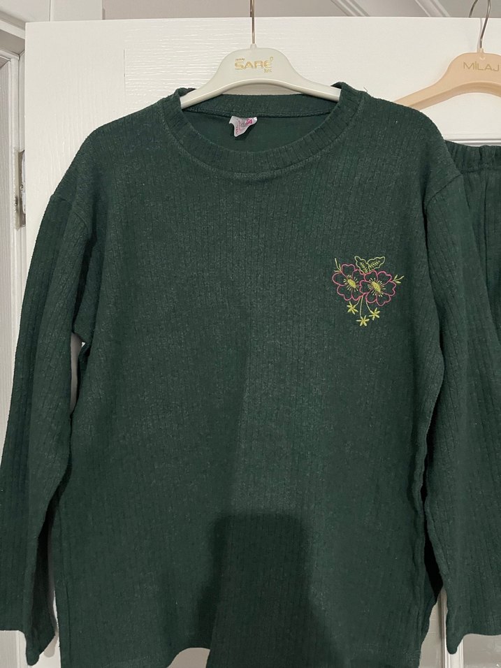 Koyu yeşil renkli, örgü dokulu, bol kesim, pijama takımı