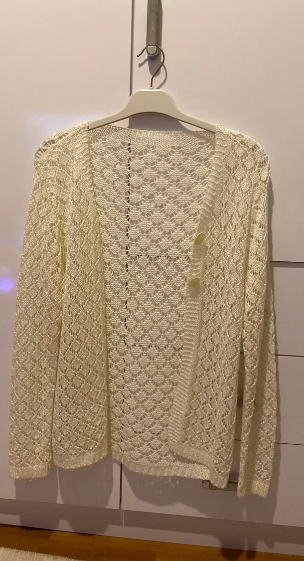 Uzun kollu bol kesim, yuvarlak yakalı ekru örgü kadın hırka.