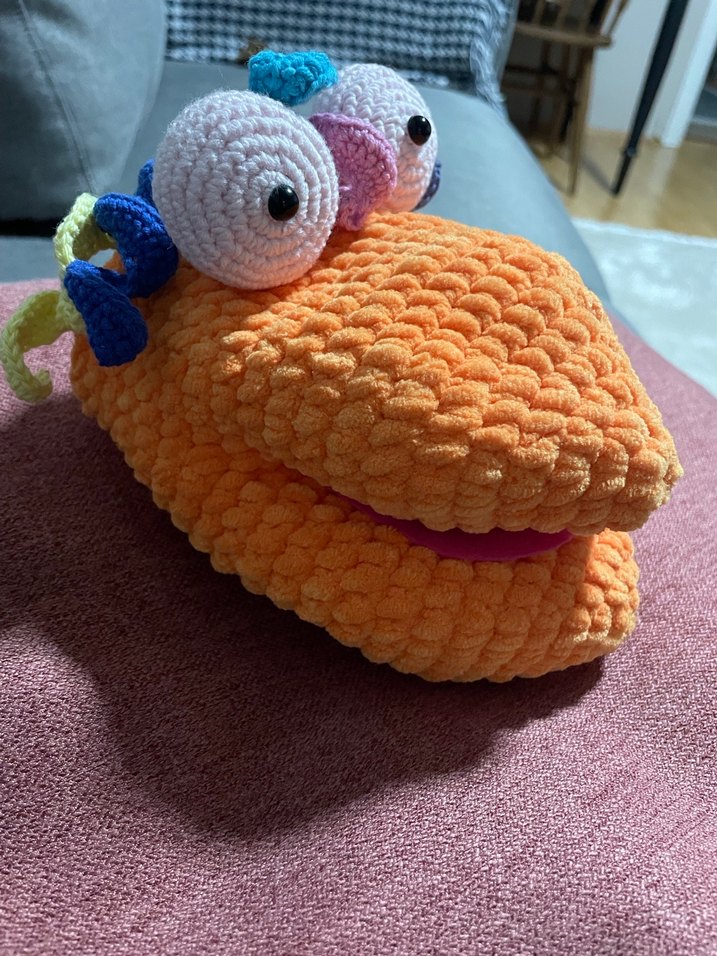 Büyük gözlere ve dokulu yumuşak kumaşa sahip renkli peluş Amigurumi oyuncak el kuklası Canlı çok renkli ve eğlenceli tasarıma sahip.