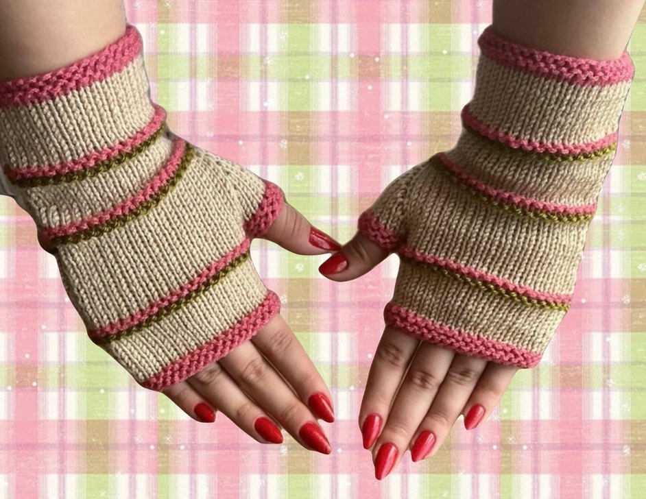 Bohem tarzda, pastel pembe ve bej renklerinde kadın örgü eldivenler. Örgü dokusu retro ve hippie havası katıyor. ✋