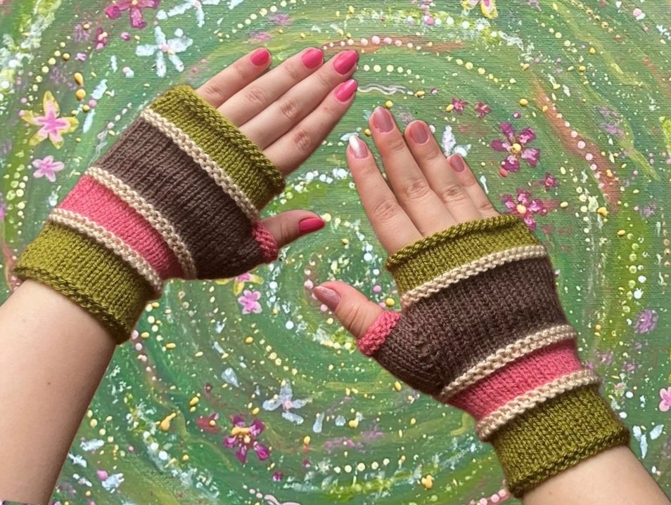 Pastel çok renkli, örgü yapıda, açık parmaklı, bohem tarzda rahat kadın eldiveni.