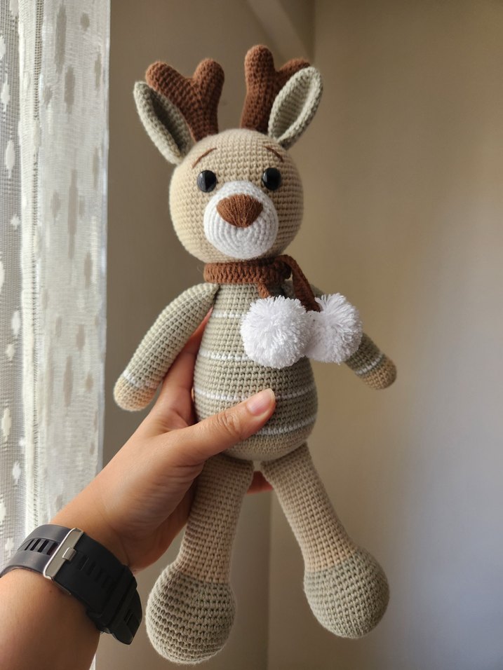 Bej ve gri renklerde, örgü yapıda geyik şeklinde amigurumi oyuncak sipariş için ve fiyat için iletişime geçin lütfen..