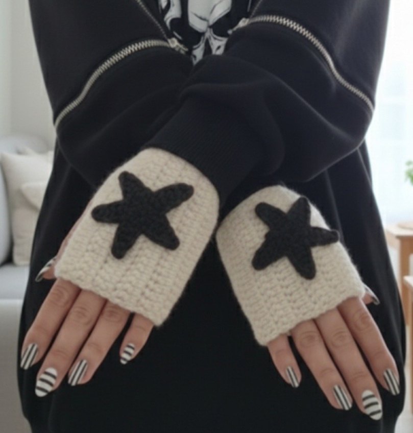 GÖRSEL BANA AİTTİR ✔️ İLAN AÇIYORUM ✔️ Yıldız desenli acı kahve örgü yarım parmak eldivenler, goth ve punk tarzları için uygundur. Yumuşak örgü kumaş rahatlık ve özgünlük sunar.