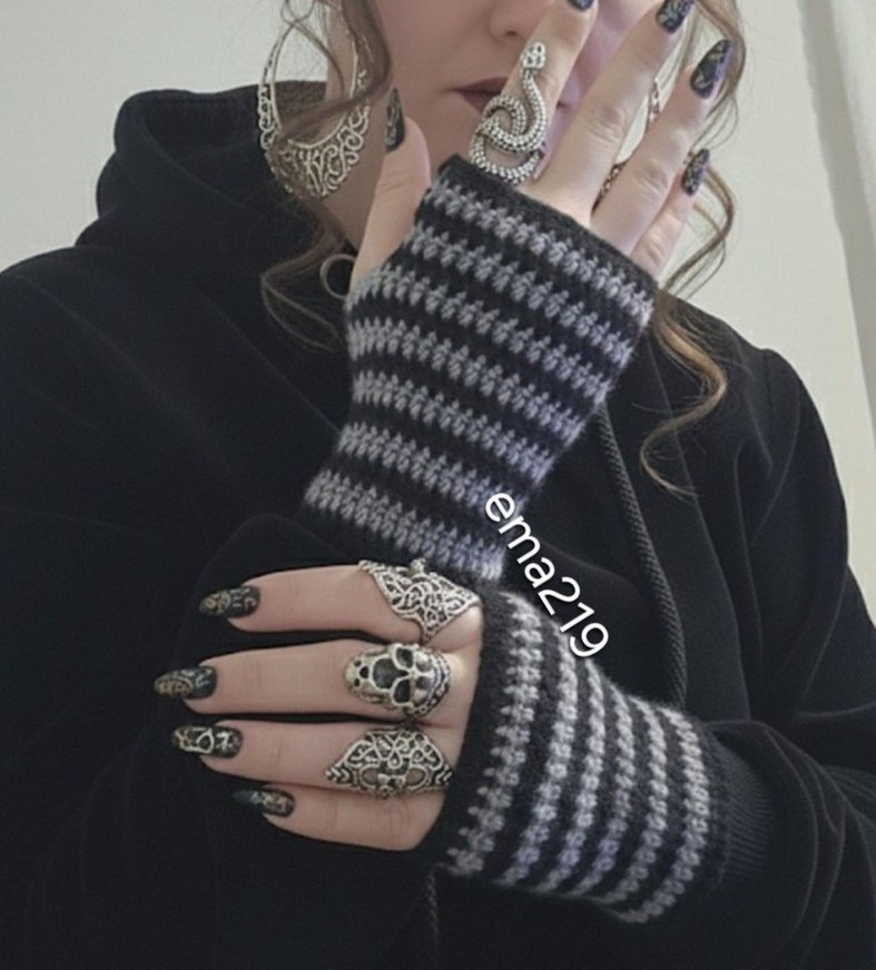 GÖRSEL BANA AİTTİR ✔️ İLAN AÇIYORUM Örgü malzemeden yapılmış, çizgili desende gotik tarzda kadın eldiveni. Bohem ve retro havası taşıyan parmakları açık modeldir.
