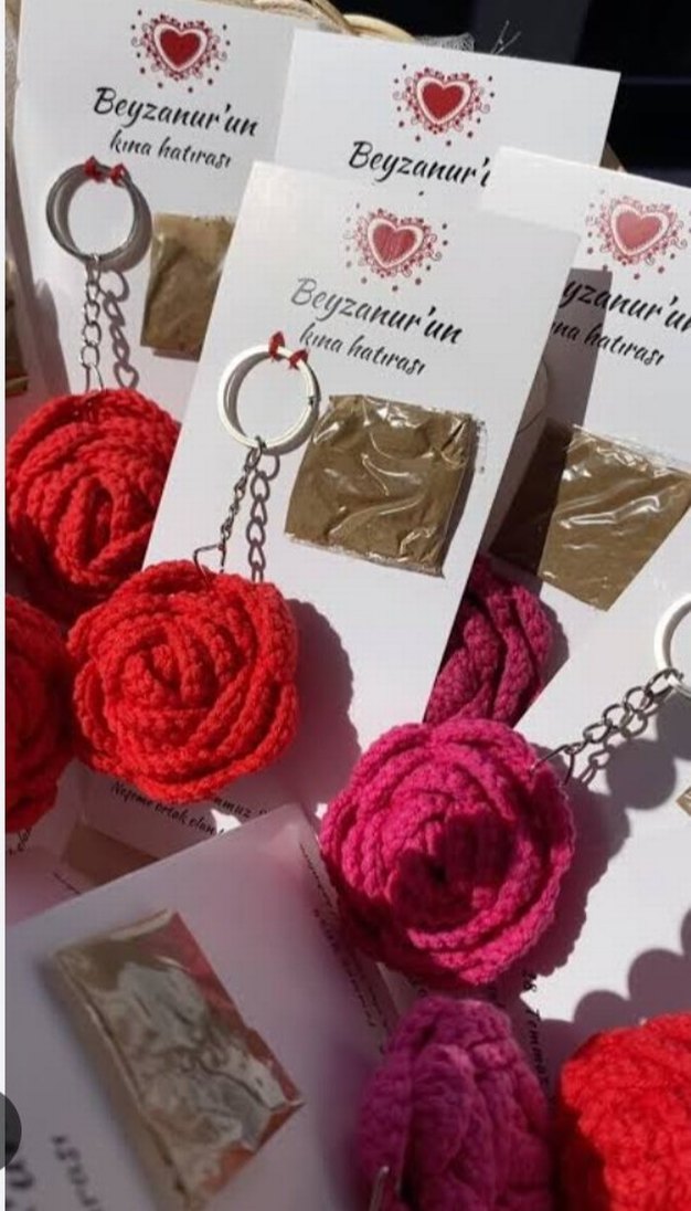 Örgü pembe gül anahtarlık, rahat ve bohem tarzda. Küçük bir aksesuar ile renkli el yapımı detaylar içerir.