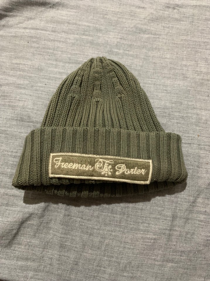 Katlanabilir manşetli, örgü yeşil bere. Rahat kullanım için yumuşak örgü kumaştan yapılmıştır. Üzerinde "Freeman Porter" etiketi bulunur.