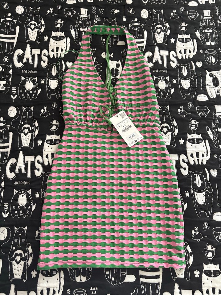Örgü kumaştan, halter yaka ve kolsuz tasarımlı, çok renkli baskılı, midi boy, dar kesim elbisedir. Sokak modası için uygundur.