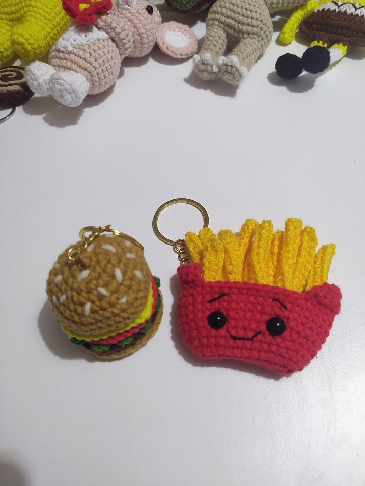 Yumuşak iplikten yapılmış, hamburger ve gülen patates şeklinde renkli örgü anahtarlıklar. Coton iple örülmüştür Hamburger: 5cm Patates: 7cm #bff #anahtarlık #hediye #arkadaş #örgü