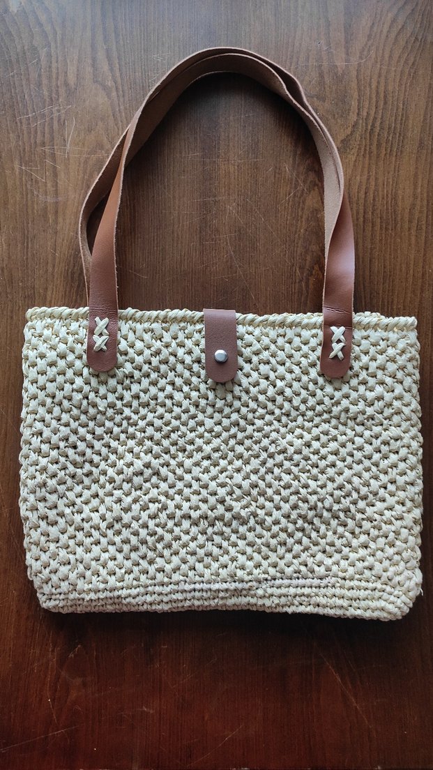el yapimi vintage y2k hasır çanta cok güzel ici geniş bej renginde Deri saplı, çıtçıtlı bej örgü kadın çantası. Hafif, desensiz ve bohem tarzda, günlük kullanıma uygun.
