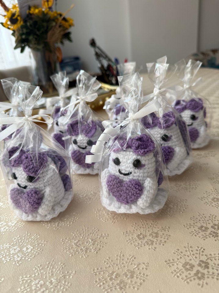 İlandaki fiyat adet fiyatdır. Ambalajlama ve kart kişiye özeldir. Adet başına +5₺ dir. Mor ve beyaz renklerde kalp detaylı el örgüsü peluş oyuncaklar, şeffaf poşetlerde beyaz kurdele ile paketlenmiştir. Yumuşak ve renkli.