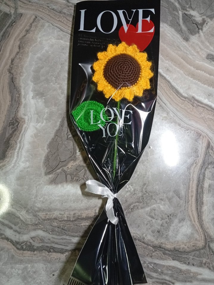 Bohem tarzda, el yapımı örgü ayçiçeği ve "LOVE" yazılı paketle süslenmiş dekoratif çiçek.