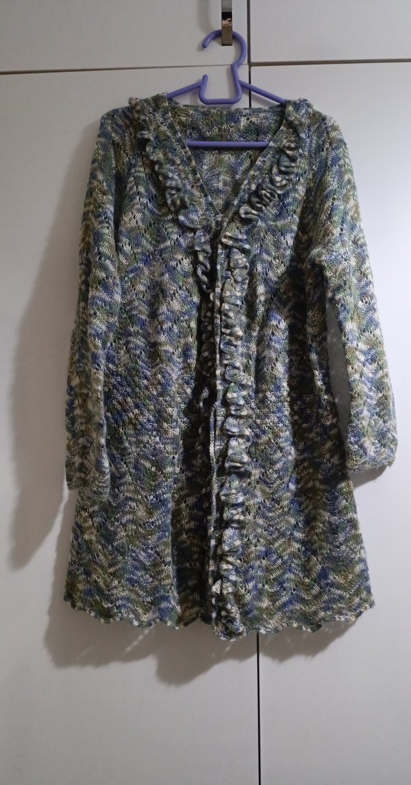 Yumuşak el örgüsü çok renkli düğmeli fırfır detaylı uzun kollu hırka