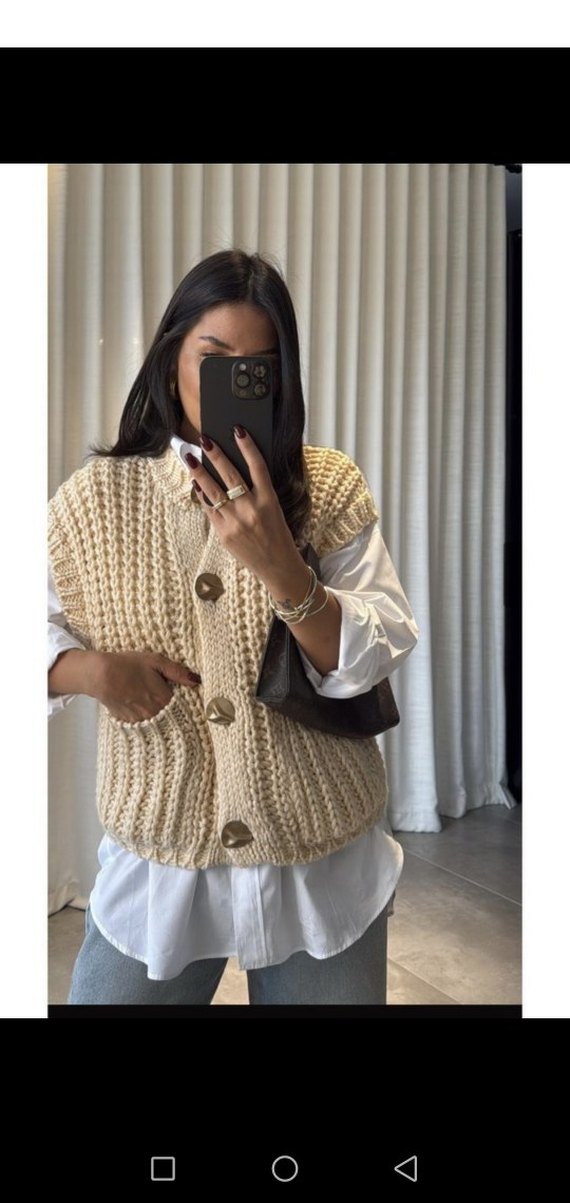 Bej renkli, kısa boylu cepli ve kayık yakalıdır. Düğmeli, örgü dokusuyla rahat bir kullanıma uygundur.