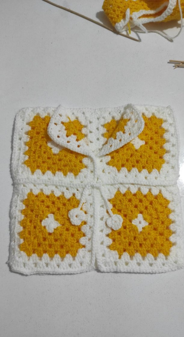 yenidoğan için yelekKızlar için uzun kollu, bol kesim örgü hırka. Sarı ve beyazrenklerde nakışlı bohem desenlidir.