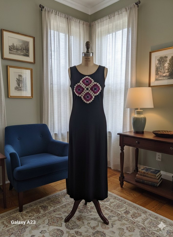 Siyah renkli göğüs kısmı tığ işi süsleme detaylı,istenirse çıkarılabilir o zaman da V yakalı düz sade elbise olacakta kullanılabilir
