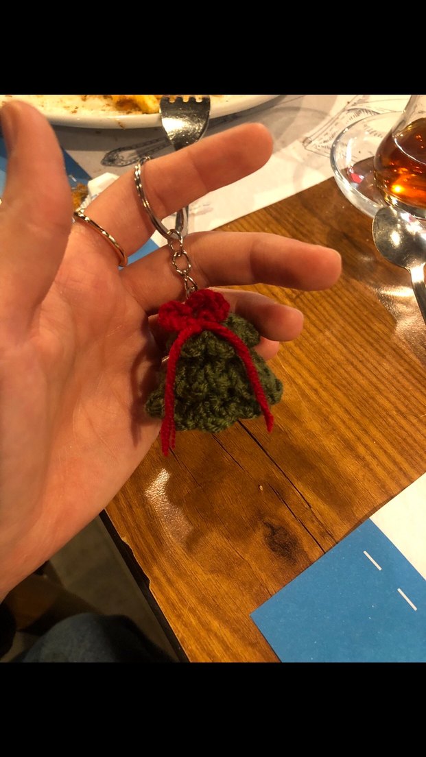 Yeşil örgü anahtarlık, bohem ve rahat tarzda. Parlak dokusu ve kırmızı fiyonk detayıyla dikkat çekiyor.