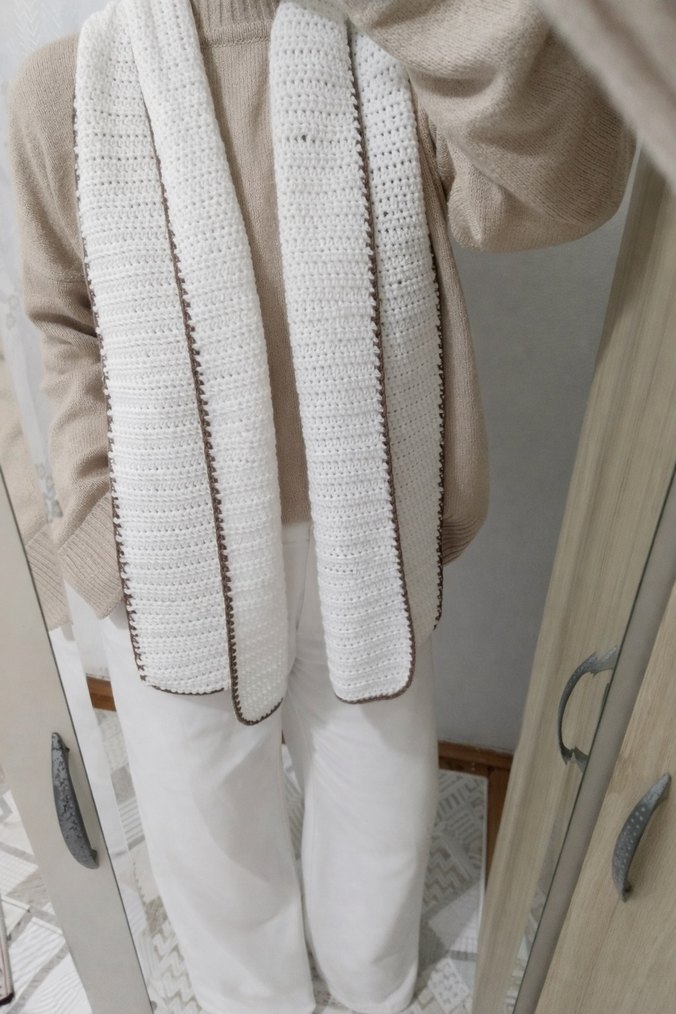 Örgü kadın şal, beyaz renkte kahverengi detaylarla rahat ve şık bir görünüm sunar.