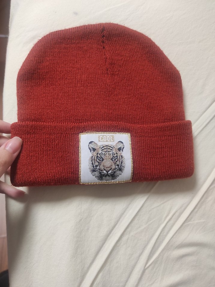 Yumuşak fleece astarlı, önünde kaplan patchi bulunan kırmızı örgü kadın bere, rahat ve sokak stiliyle bohem havası sunar.