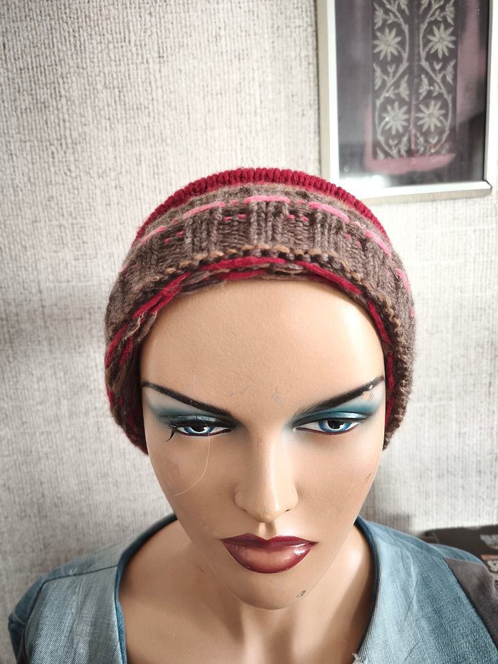 Kahverengi ve gri tonlarında örgü kadın bere, rahat ve retro bohem tarzıyla dikkat çeker. Hippi ve karşı kültür havası taşır.