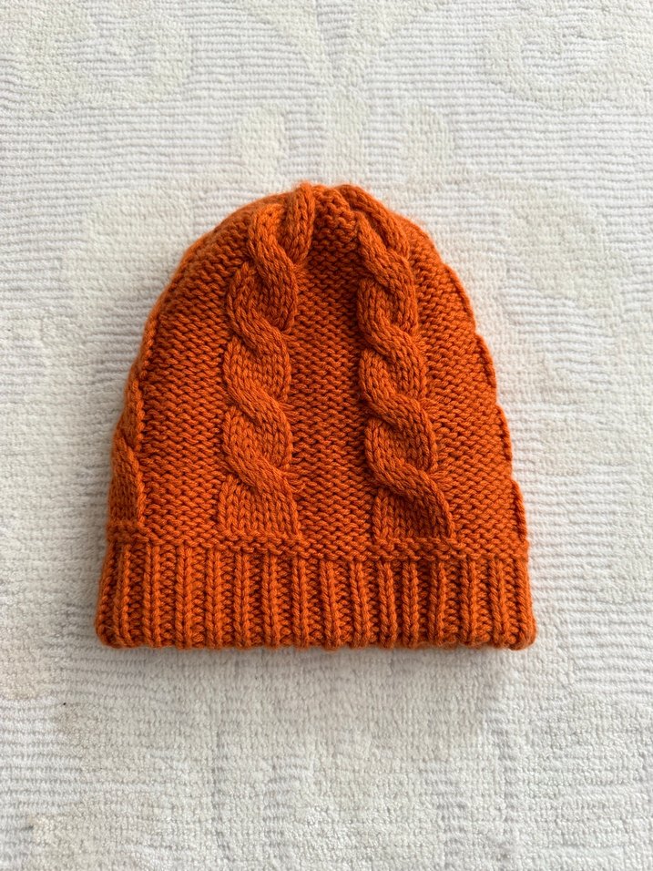 Turuncu renkte, yumuşak ve sıcak dokulu örgü kadın bere, rahat ve günlük kullanım için uygundur.